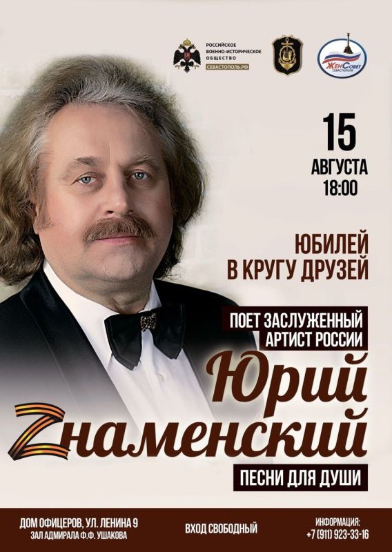 15 августа в Доме офицеров Черноморского Флота состоится концерт «Песни для души», посвященный юбилею Заслуженного артиста России, певца Юрия Знаменского. В репертуаре артиста — классические произведения, ретро-шлягеры, песни известных советских и...