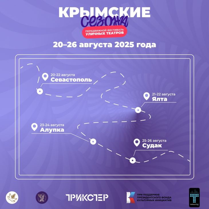 С 20 по 27 августа 2025 года в Крыму пройдет первый передвижной фестиваль уличных театров «Крымские сезоны». Фестиваль охватит несколько крупных городов Крыма — Севастополь (20?22 августа), Ялта (21?22 августа), Алупка (23?24 августа) и Судак (25?26...
