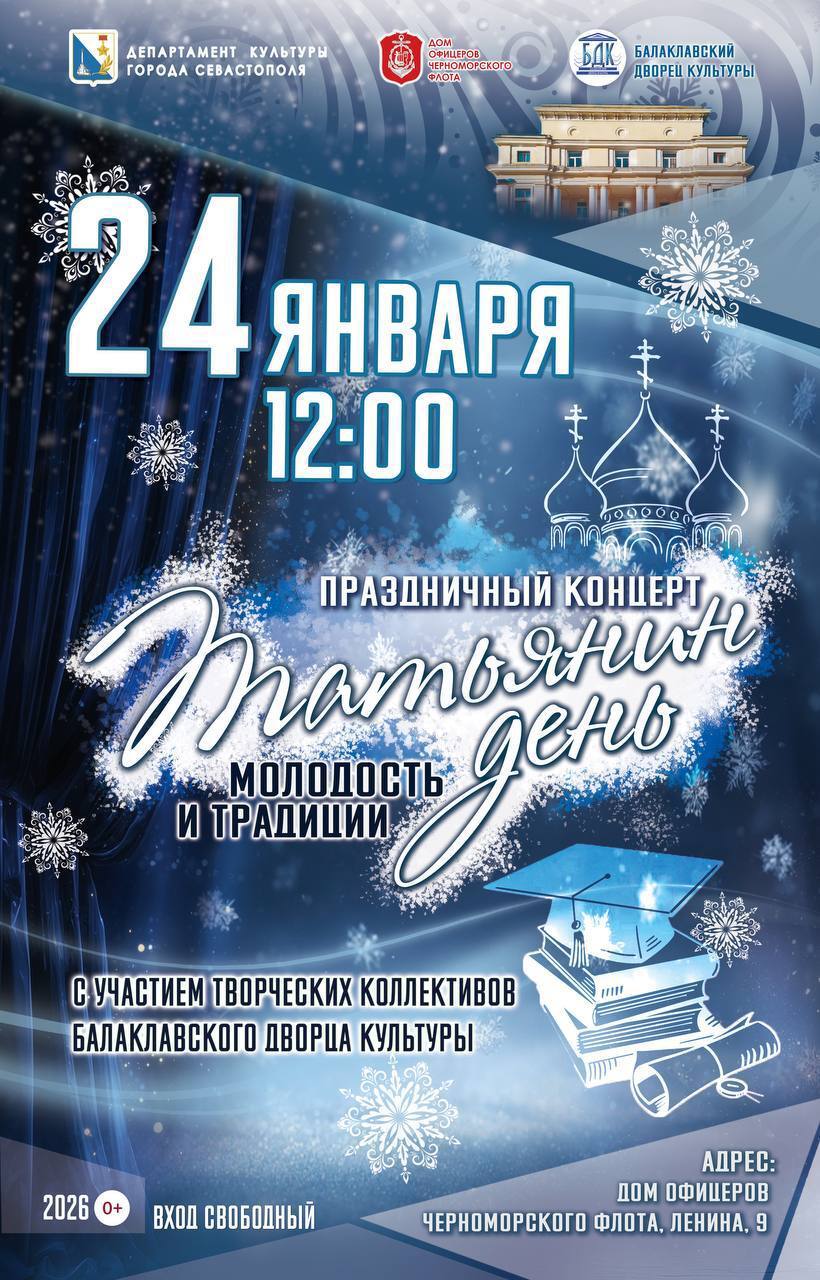 В преддверии Дня российского студенчества в Доме офицеров Черноморского флота пройдет праздничный концерт «Татьянин день: молодость и традиции». Мероприятие посвящено всем, кто учится, и тем, кто хранит дух студенческой юности.