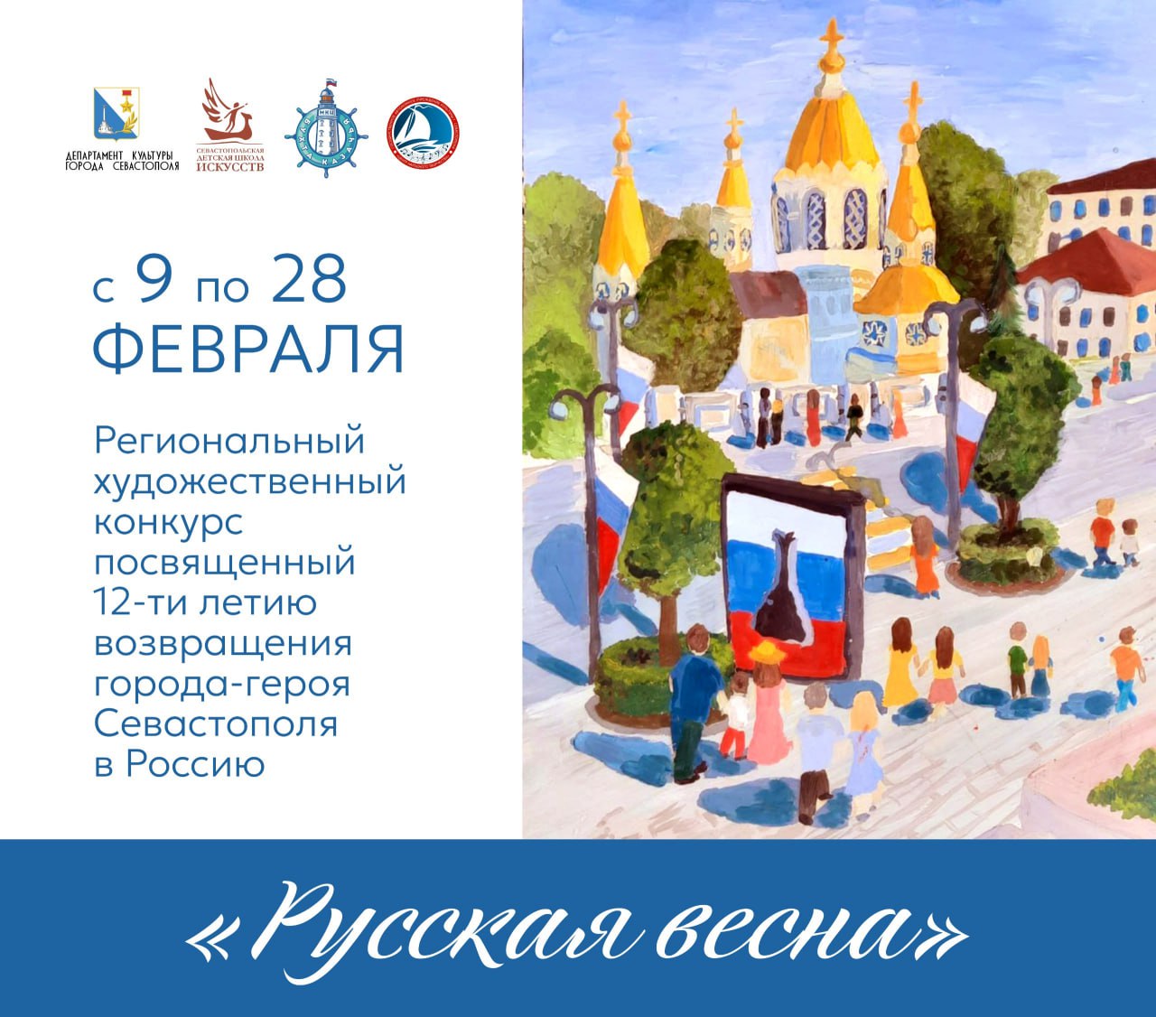 Севастопольская детская школа искусств приглашает принять участие в региональном конкурсе детского рисунка «Русская весна», посвященном Дню возвращения Севастополя и Крыма в состав Российской Федерации. Конкурс проходит при поддержке Департамента культуры города Севастополя. Соорганизаторы — региональный ресурсный центр развития образования в сфере культуры и искусства МКЦ «Бута Казачья» и Центр народного творчества.