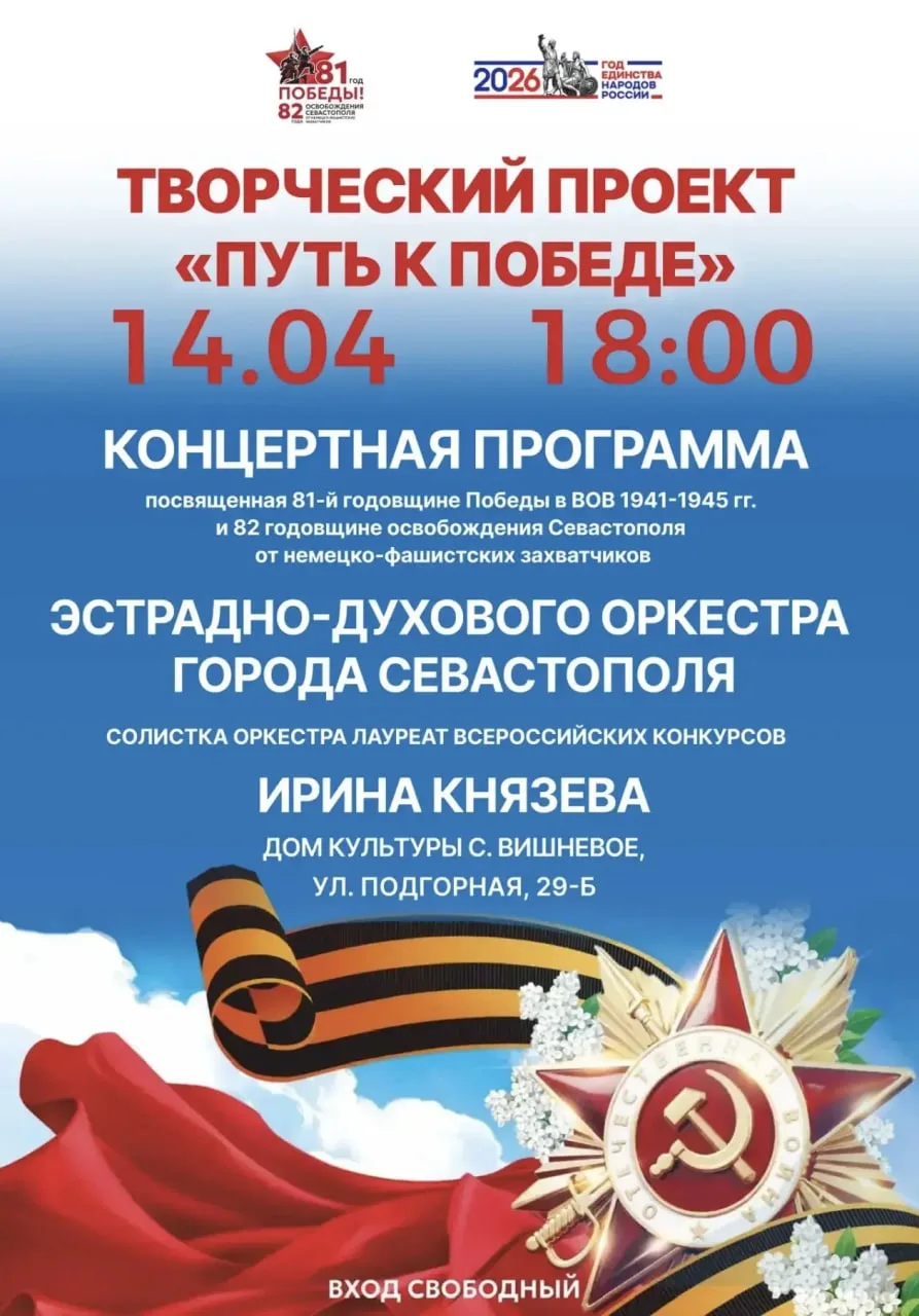 В этот памятный день, 14 апреля в 18:00, в Доме культуры села Вишневое (ул. Подгорная, 29Б) выступят лауреат всероссийских конкурсов Ирина Князева и Эстрадно-духовой оркестр города Севастополя Центра народного творчества с патриотической концертной программой.