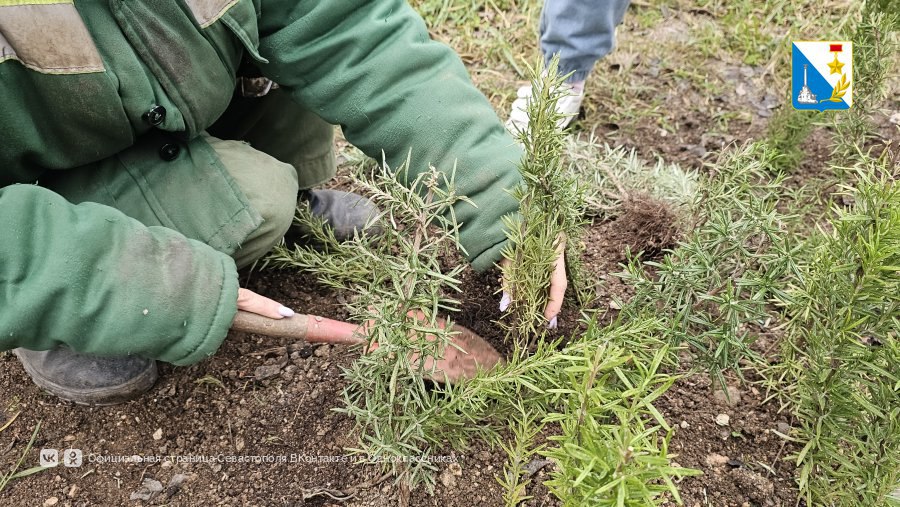 Озеленители высадили 300 кустов розмарина, 10 кипарисов, 12 сосен, а также платаны, спиреи и другие растения.