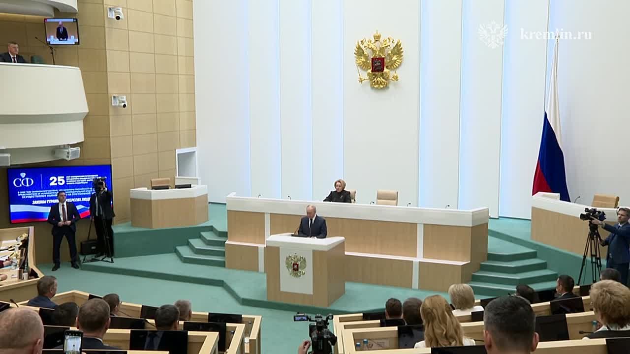 Президент выступает в Совете Федерации, где проходит пленарное заседание, завершающее осеннюю сессию.