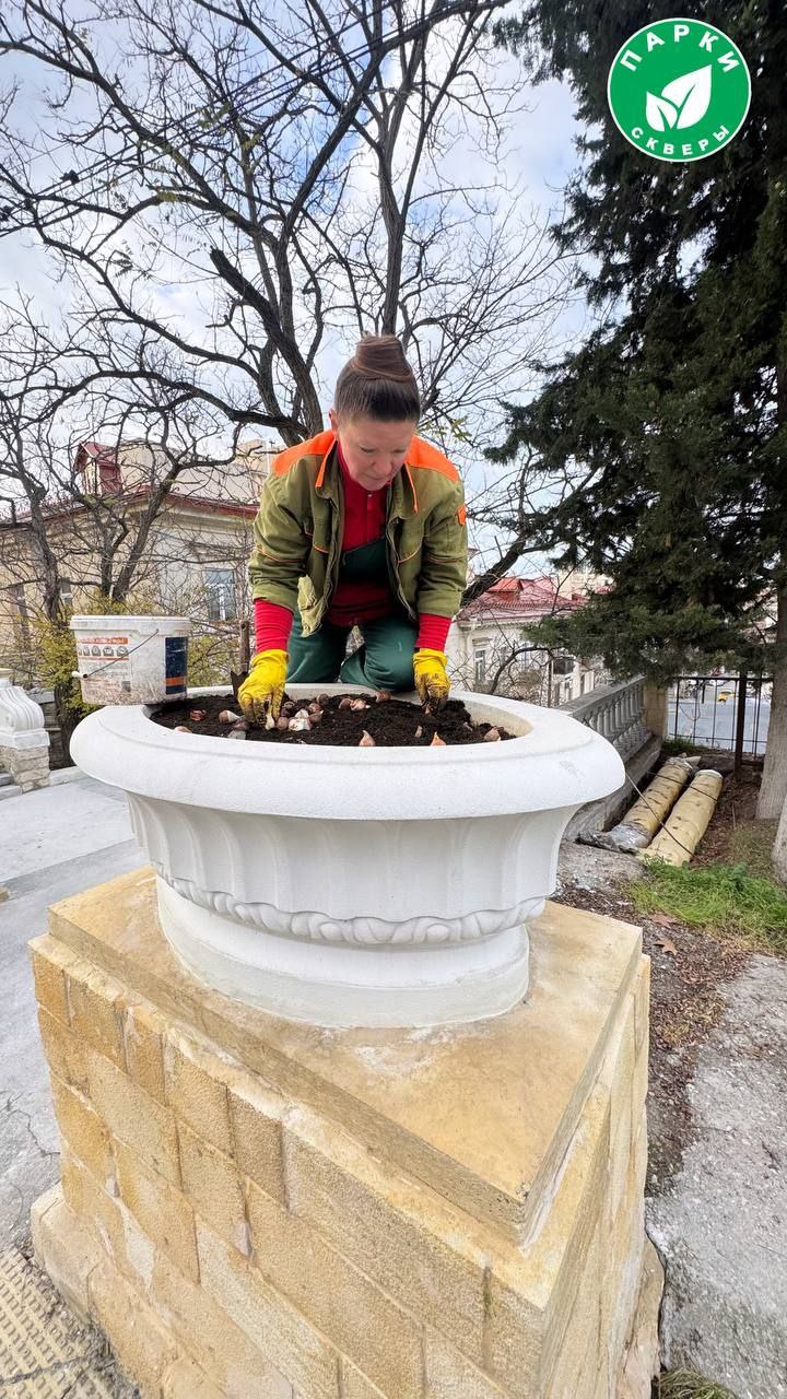 На Таврической лестнице в вазонах убрали сорняки, прорыхлили почву и высадили луковицы тюльпанов.