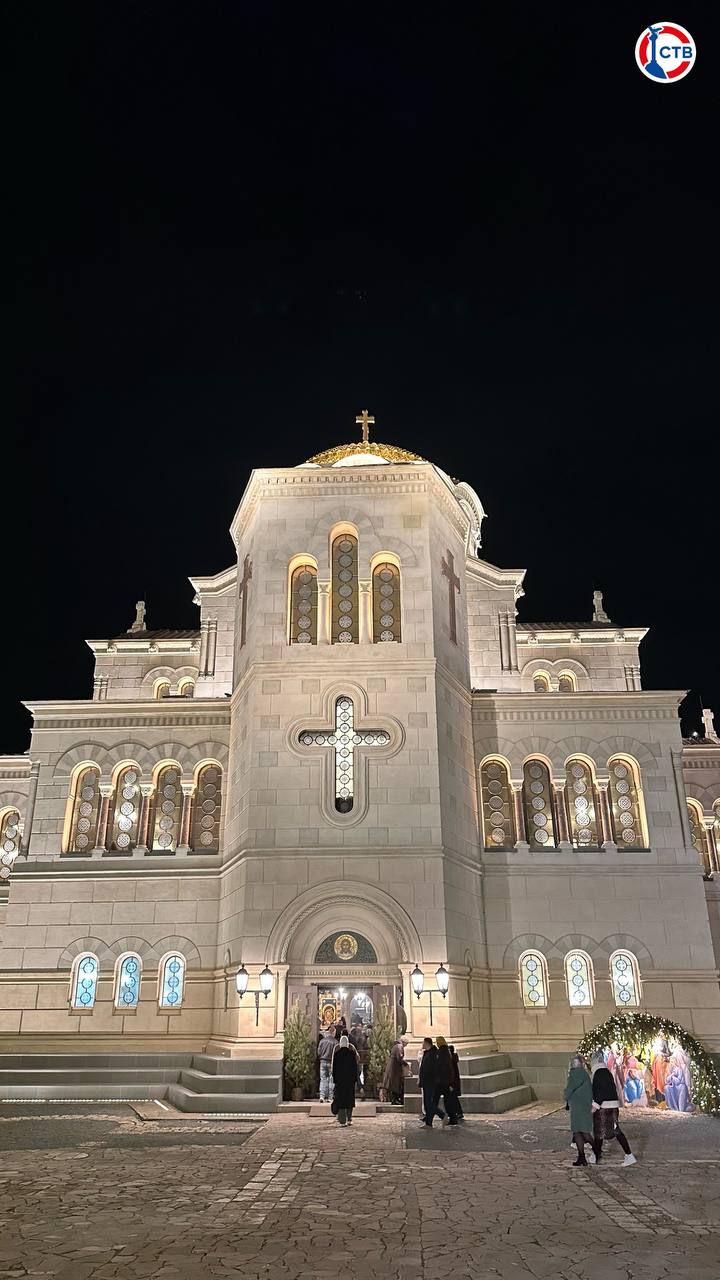 Служба проходит в Свято-Владимирском соборе, откуда телеканал СТВ ведет прямую трансляцию.
