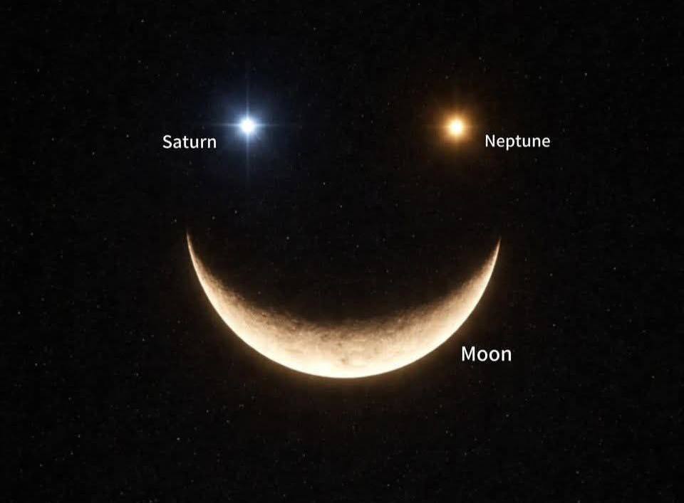 Сегодня после захода Солнца при ясной погоде жители России смогут увидеть редкое астрономическое явление: Луна, Сатурн и Нептун выстроятся в созвездии Рыб, образуя на небе форму смайлика.