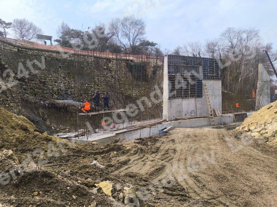 Конструкция монолитная – армированный каркас заливают бетоном. На объекте трудятся десять человек и четыре единицы техники. Так же предусмотрена установка перильного ограждения сверху подпорной стены.