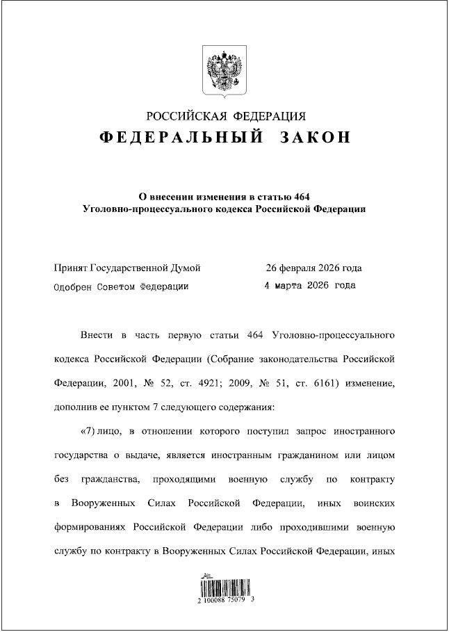 Путин подписал закон о запрете на выдачу в другие страны для уголовного преследования иностранцев, проходящих службу по контракту в ВС РФ и участвовавших в боевых действиях в составе российских войск.