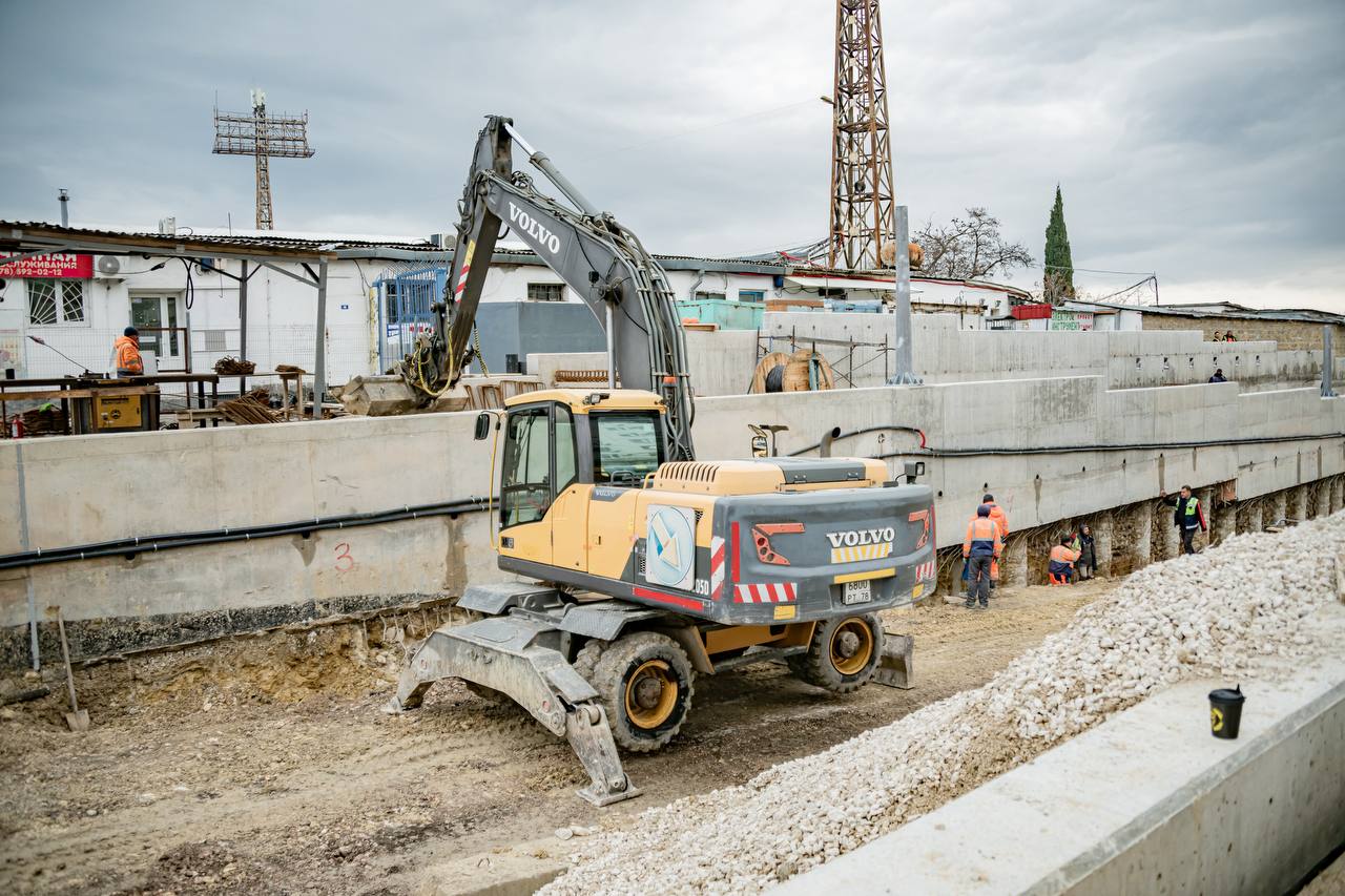 На площадке постоянно работают около 50 человек и техника. Сейчас «ВАД» занимается «начинкой» — переустраивают сети связи, водоотведения и освещения. Сейчас начали готовить основание под тротуары и лестницы. Уже с 1 февраля на лестничных пролетах начнут укладывать плитку. Все работы выполняются параллельно, в том числе по устройству основной монолитной части подпорных стен.