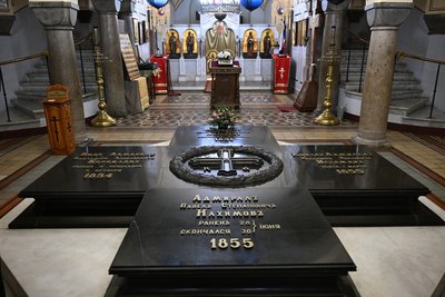 У места захоронения вице-адмирала Владимира Алексеевича Корнилова, адмиралов Михаила Петровича Лазарева, Павла Степановича Нахимова и контр-адмирала Владимира Ивановича Истомина благочинный Центрального округа протоиерей Сергий Халюта отслужил панихиду.