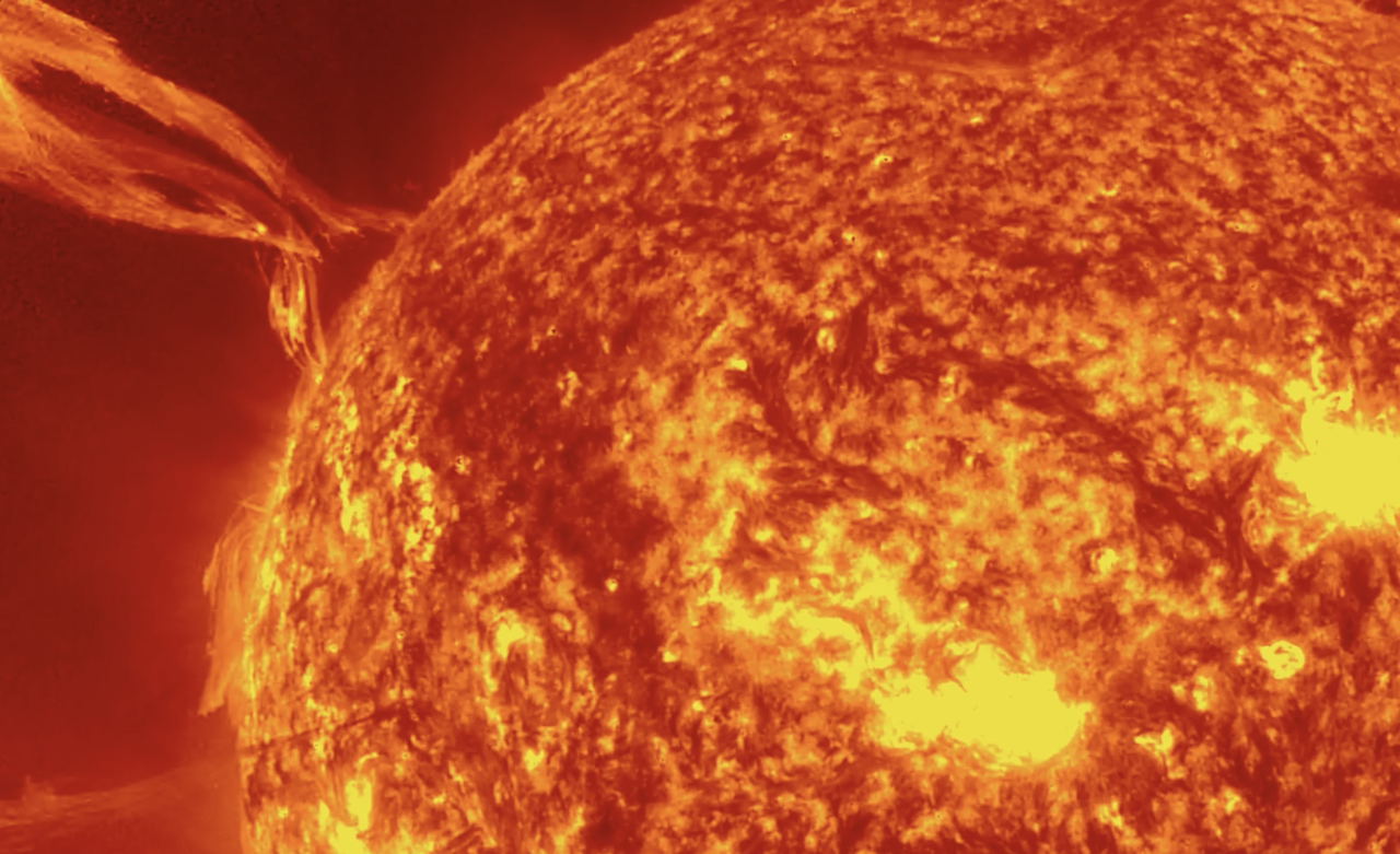 От Солнца оторвался гигантский протуберанец – он стал одним из крупнейших в 2025 году. Это плотное облако плазмы, которое поднимается и удерживается над поверхностью звезды магнитным полем. Визуально явление напоминает светящуюся арку или петлю.