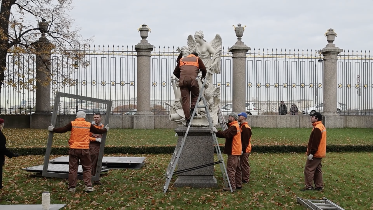 Их укрывают хлопковой тканью и помещают в особые деревянные футляры, чтобы защитить мрамор от перепадов температуры, осадков и конденсата, рассказали специалисты Службы реставрации ценностей Русского музея.