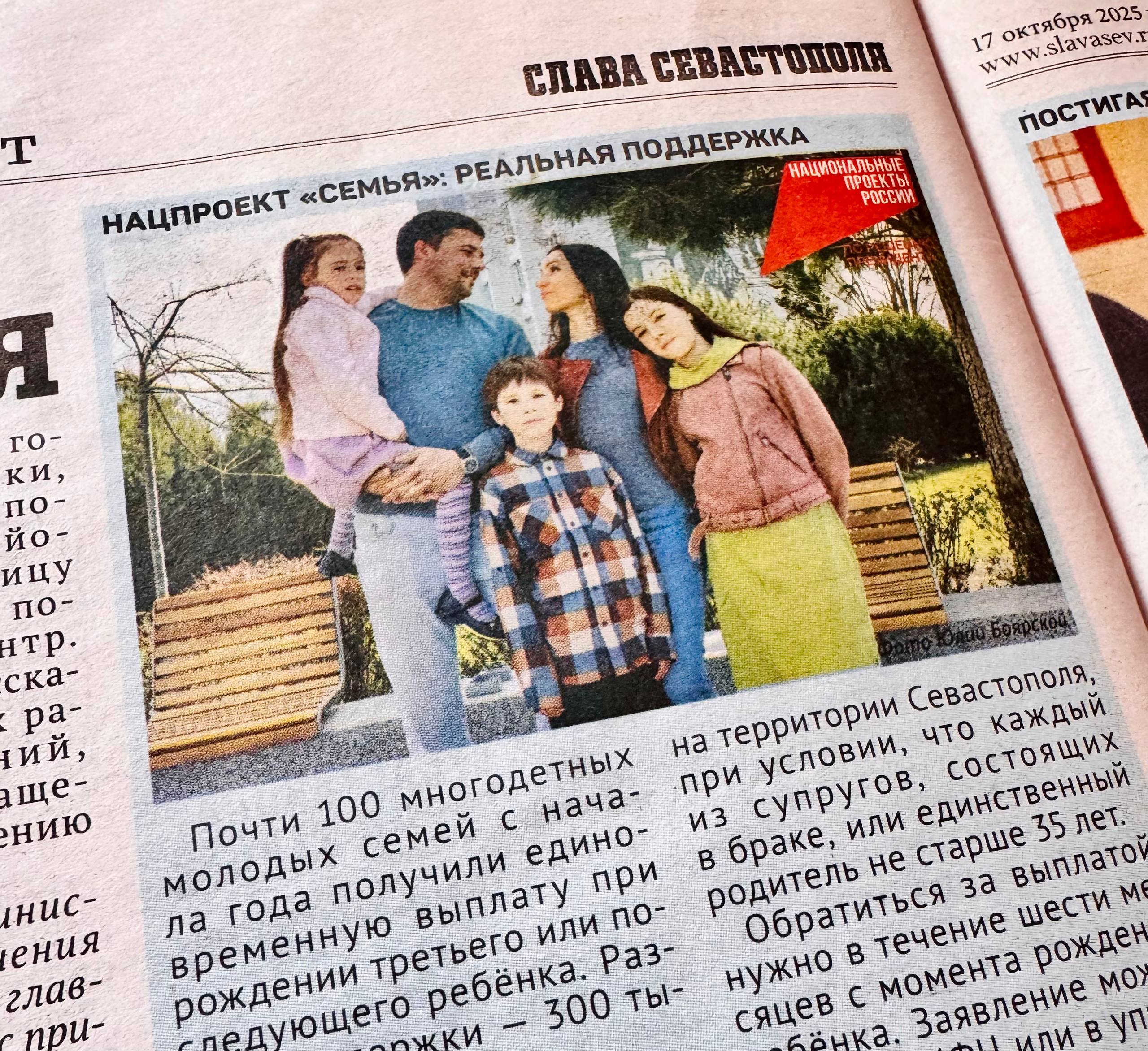 В новом выпуске газеты «Слава Севастополя» мы рассказали о мерах поддержки многодетных молодых семей — почти 100 из них с начала года получили выплату при рождении третьего или последующего ребёнка.