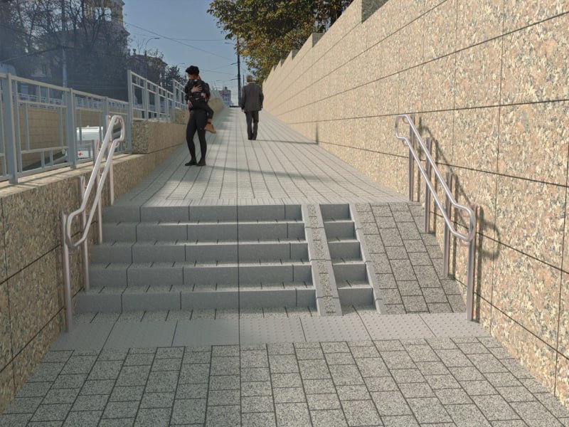 Специалисты единогласно выбрали комплексное решение: кованые черные ограждения, серая вибропрессованная плитка с гранитной крошкой и тактильная плитка серого цвета для создания доступной среды.