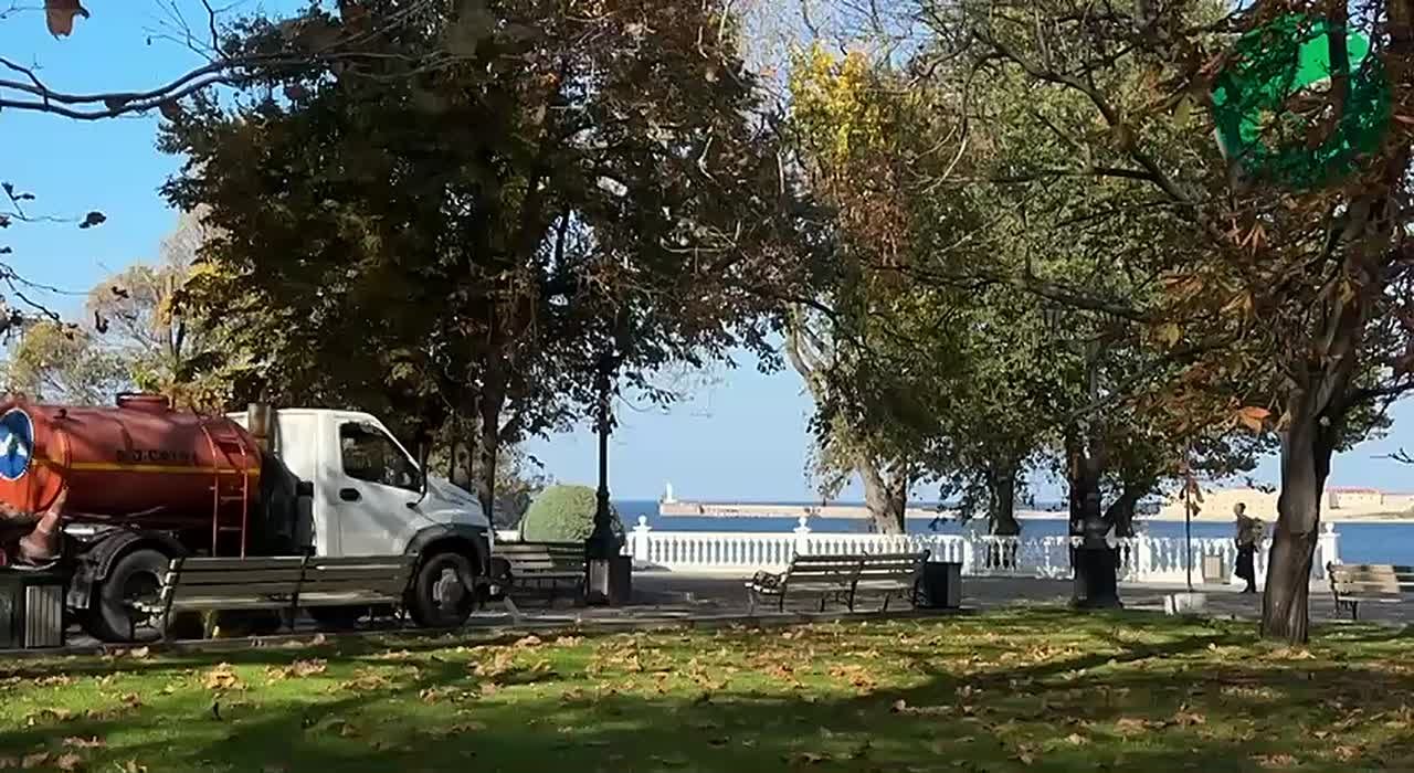 ГБУ «Парки и скверы» проводит плановую осеннюю уборку территорий. Спецтехника и рабочие бригады заняты сбором опавшей листвы и мытьем тротуарной плитки.