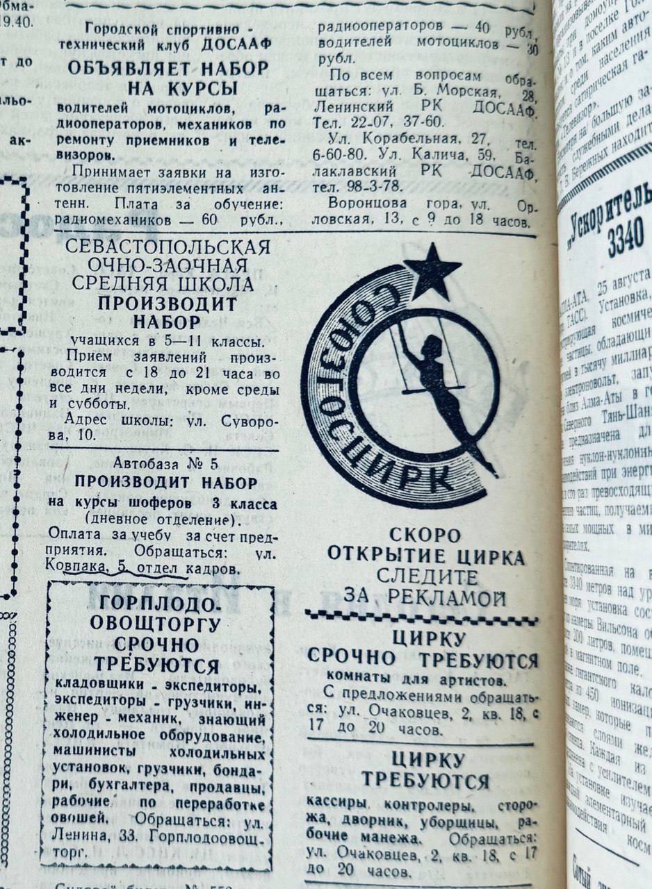 Раздел объявлений и рекламы в газете «Слава Севастополя», 1964 год