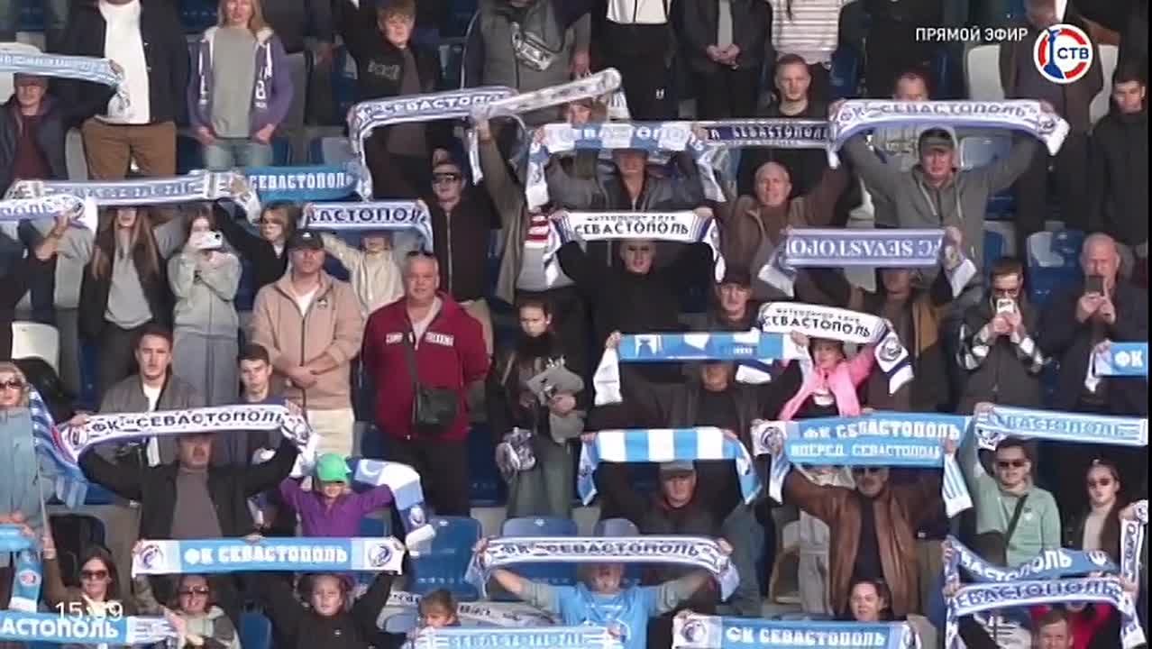 Традиционно перед игрой звучит гимн Севастополя. Только посмотрите, какая атмосфера царит на стадионе!