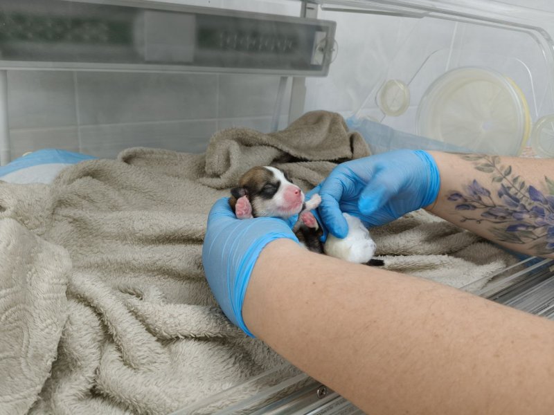 В госветклинике на улице Могилевская врачи выходили трехдневного щенка породы корги. Его мама погибла после родов и владельцы доставили его в реанимацию. Малыш находился в специальном боксе (инкубаторе) для новорожденных животных, где поддерживаются комфортные температура и влажность.