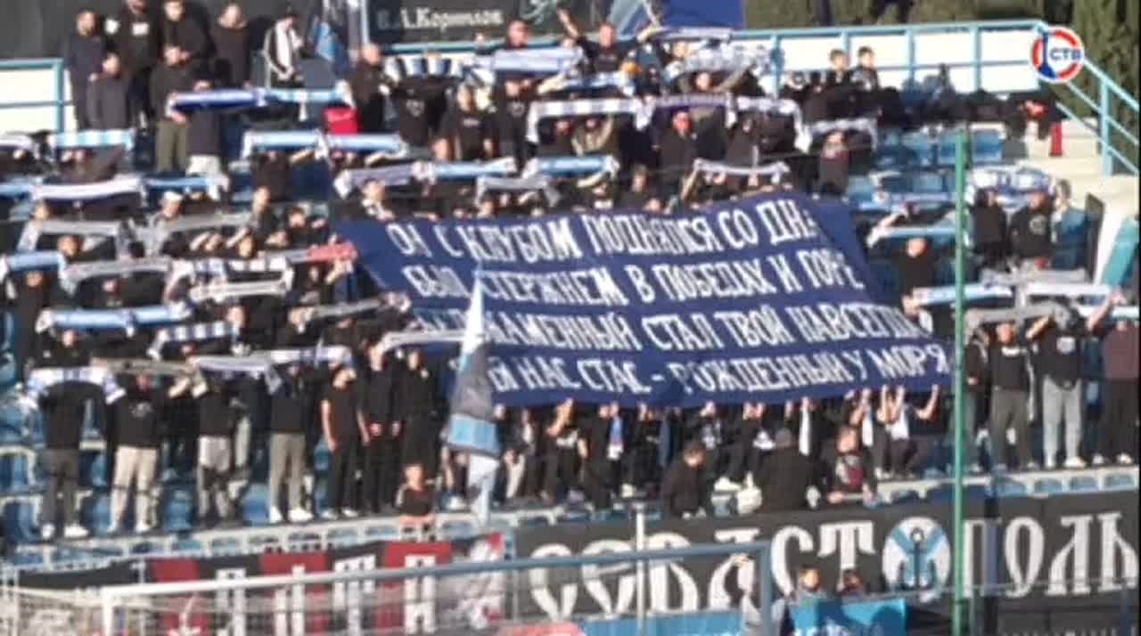 Традиционно перед игрой звучит гимн Севастополя. Только посмотрите, какая атмосфера царит на стадионе!