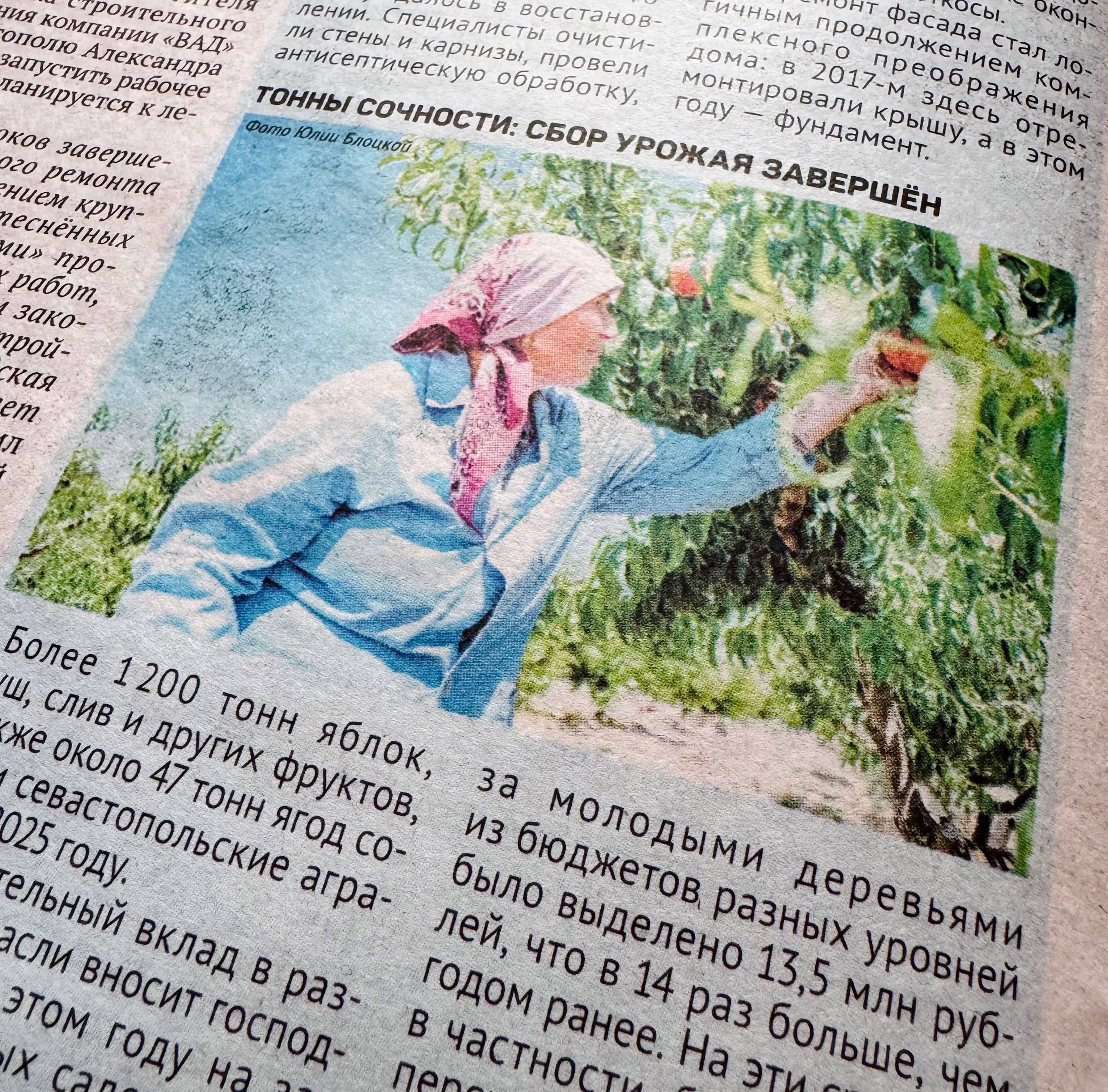 В новом выпуске газеты «Слава Севастополя» мы рассказали о том, что в этом году городские аграрии собрали более 1200 тонн яблок, груш, слив и других фруктов, а также около 47 тонн ягод.