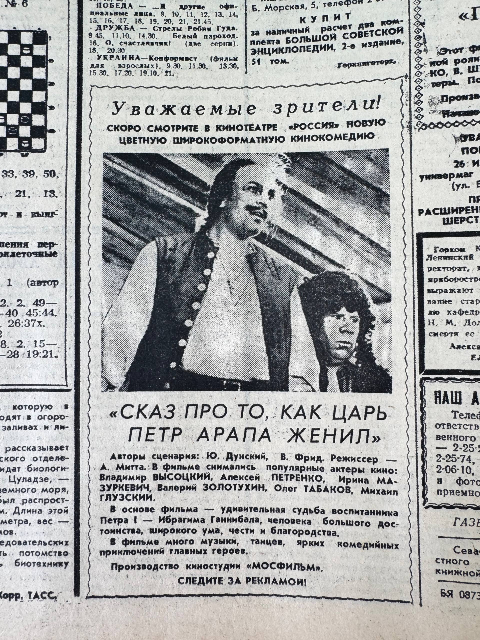 Вырезка из газеты «Слава Севастополя» о новой цветной широкоформатной кинокомедии, которую показывали в кинотеатре «Россия», ноябрь 1976 года.
