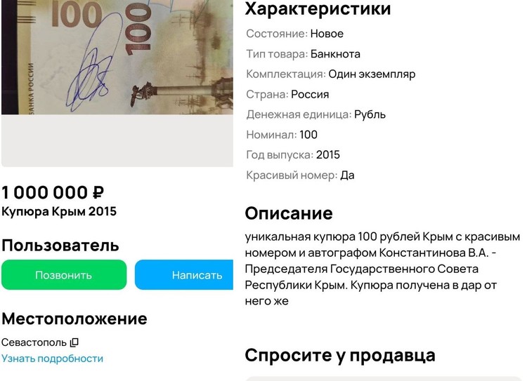 - Уникальная купюра 100 рублей с красивым номером и автографом Константинова В.А – Председателя Государственного совета Республики Крым. Купюра получена в дар от него же, - описал свой товар продавец по имени Сергей.