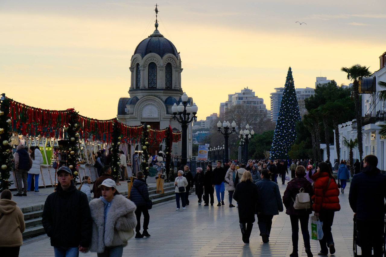 Новогоднее настроение появилось в Ялте. На набережной города-курорта установили несколько искусственных ёлок, оформленных красно-золотыми и село-голубыми шарами, местами уже засветились гирлянды.