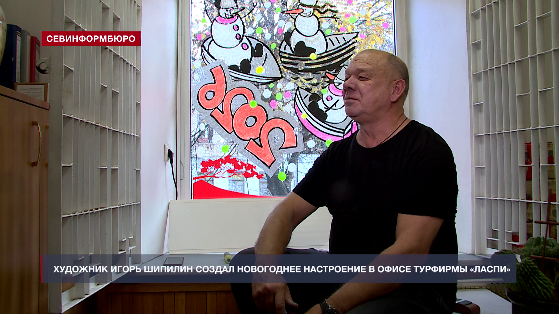 ИГОРЬ ШИПИЛИН, член Союза художников России и Товарищества южнорусских художников: «Весь коллектив – это мои друзья. Попросили меня, в прошлом году в первый раз мы это делали, разрисовать окна. Ну, а почему нет? Праздничное настроение надо создавать. Это хорошо, когда люди идут и видят, что город готовится к празднику. Сотрудники видят это тоже. Соответствующее настроение возникает. Даже вот я рисовал, две девчонки шли, увидели, постучали в окно, говорят «Ооо» и пошли дальше».