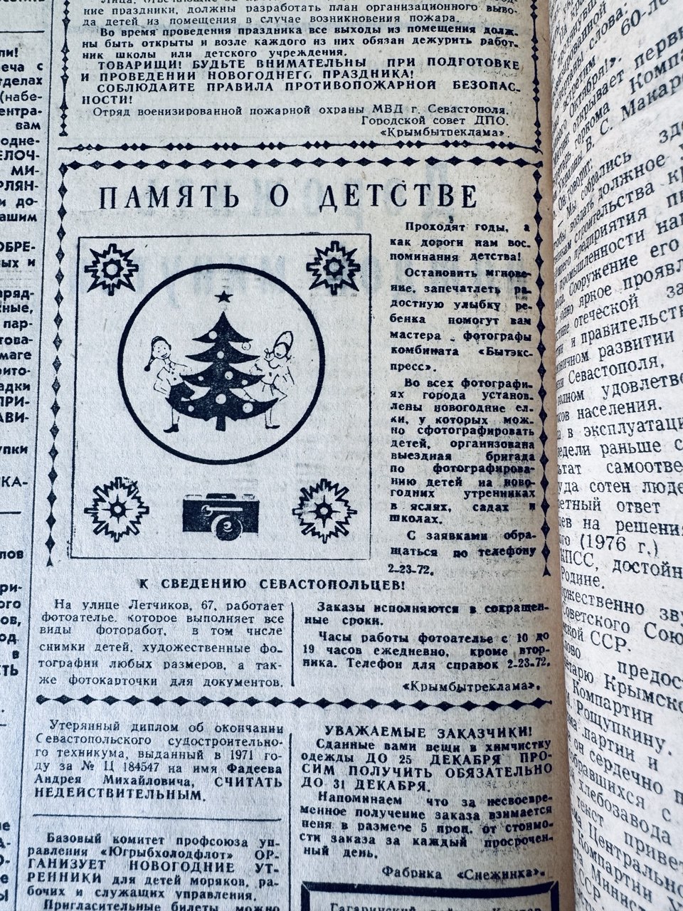 Отдел объявлений и рекламы в газете «Слава Севастополя», выпуск за декабрь 1976 года.