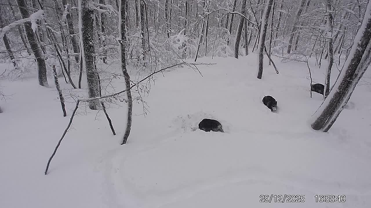 В фотоловушку попало семейство кабанов. Кажется, будто лесные жители радуются снегу, как и дети. В высоком снежном покрове им приходится прокладывать дорогу своими пятачками. Вместе они дружно справляются с этой задачей!