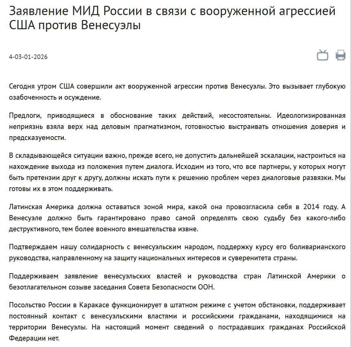 Акт вооружённой агрессии США против Венесуэлы вызывает глубокую озабоченность и осуждение – МИД РФ.