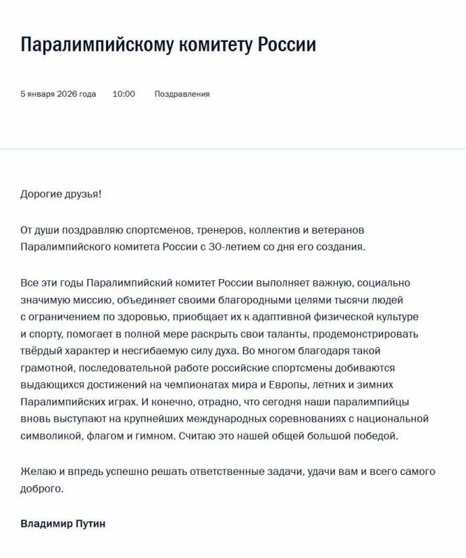 Путин поздравил Паралимпийский комитет России с 30-летием