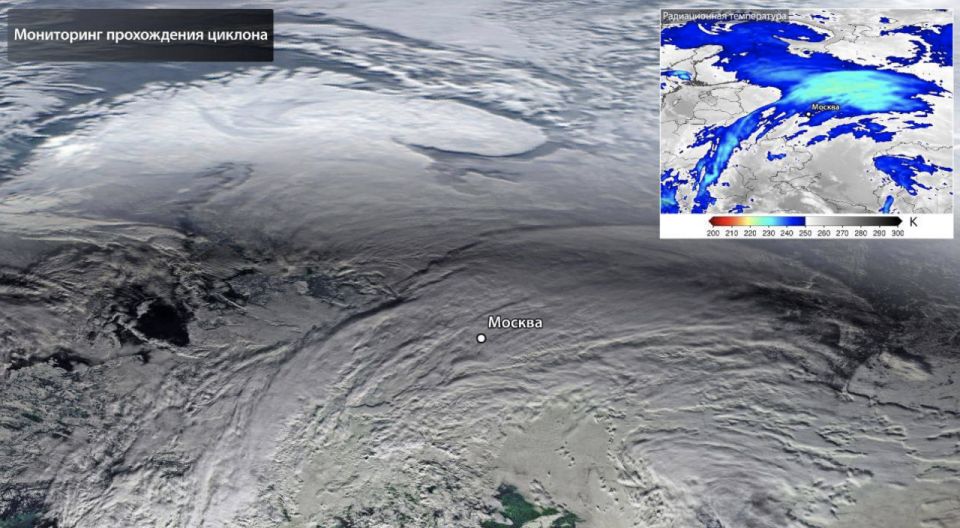 Госкорпорация «Роскосмос» опубликовала снимок, сделанный спутниками, с циклоном, который надвигается на Москву.
