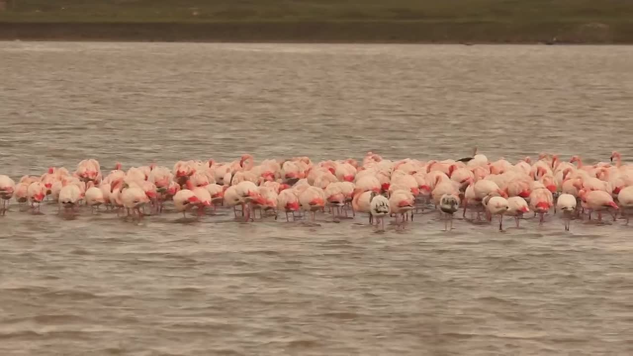 Фламинго чувствуют себя хорошо: разыскивают рачков артемий и личинок комаров-звонцов.