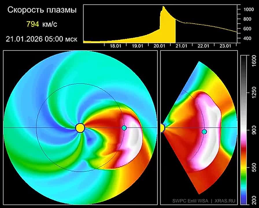 По данным Института космических исследований РАН и Института солнечно-земной физики СО РАН, 20 января на Землю обрушится облако плазмы, выброшенное Солнцем. Пик воздействия ожидается в середине дня. Это явление может привести к возникновению мощных магнитных бурь, которые достигнут опасного уровня G4 (тяжёлые). Специалисты оценивают вероятность такого сценария примерно в 10%.
