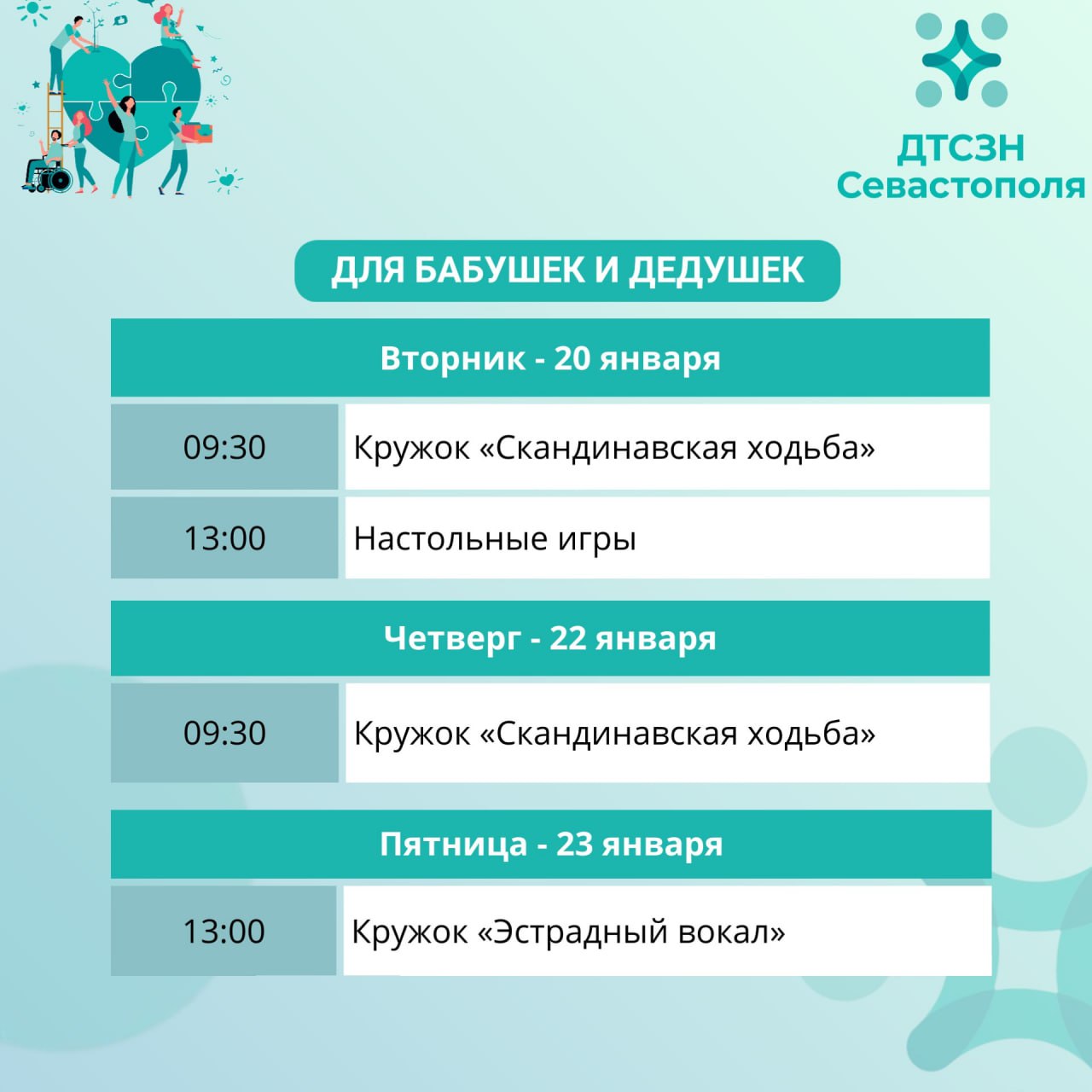 Чтобы скорее присоединиться к ним, приходите в наш Севастопольский центр соцобслуживания: ул. Хрусталева, 27, тел.: 44-36-62, +7(978) 933-53-49, (время работы: пн-чт с 8.00 до 17.00, пт. с 8.00 до 15.45, обеденный перерыв с 12.00 до 12.45) и выбирайте занятия по душе.
