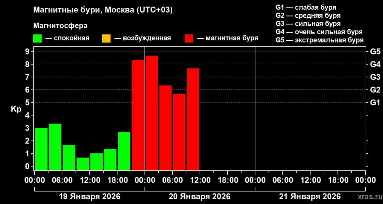 Шанс, что она дойдёт до максимального уровня (G5), крайне мал — менее 5%. Основная масса солнечной плазмы, вызвавшей эту бурю, уже прошла мимо Земли и направляется к Юпитеру. Завтра она накроет комету 3I/ATLAS, которая сейчас находится между нашей планетой и Юпитером.