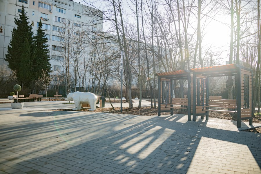 Сегодня же почти 3 тысячи квадратных метров обновленного общественного пространства — это место, где дети могут покататься на качелях и поиграть с девятью полигональными фигурами в виде животных, пока взрослые отдыхают на новых современных лавочках.