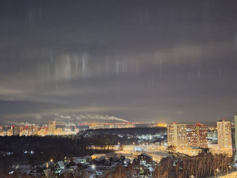 Сияющие световые столбы появились в ночном небе Москвы. Это редкое оптическое явление возможно только при сильных морозах, когда в нижних слоях атмосферы формируются микроскопические ледяные кристаллы, отражающие свет.