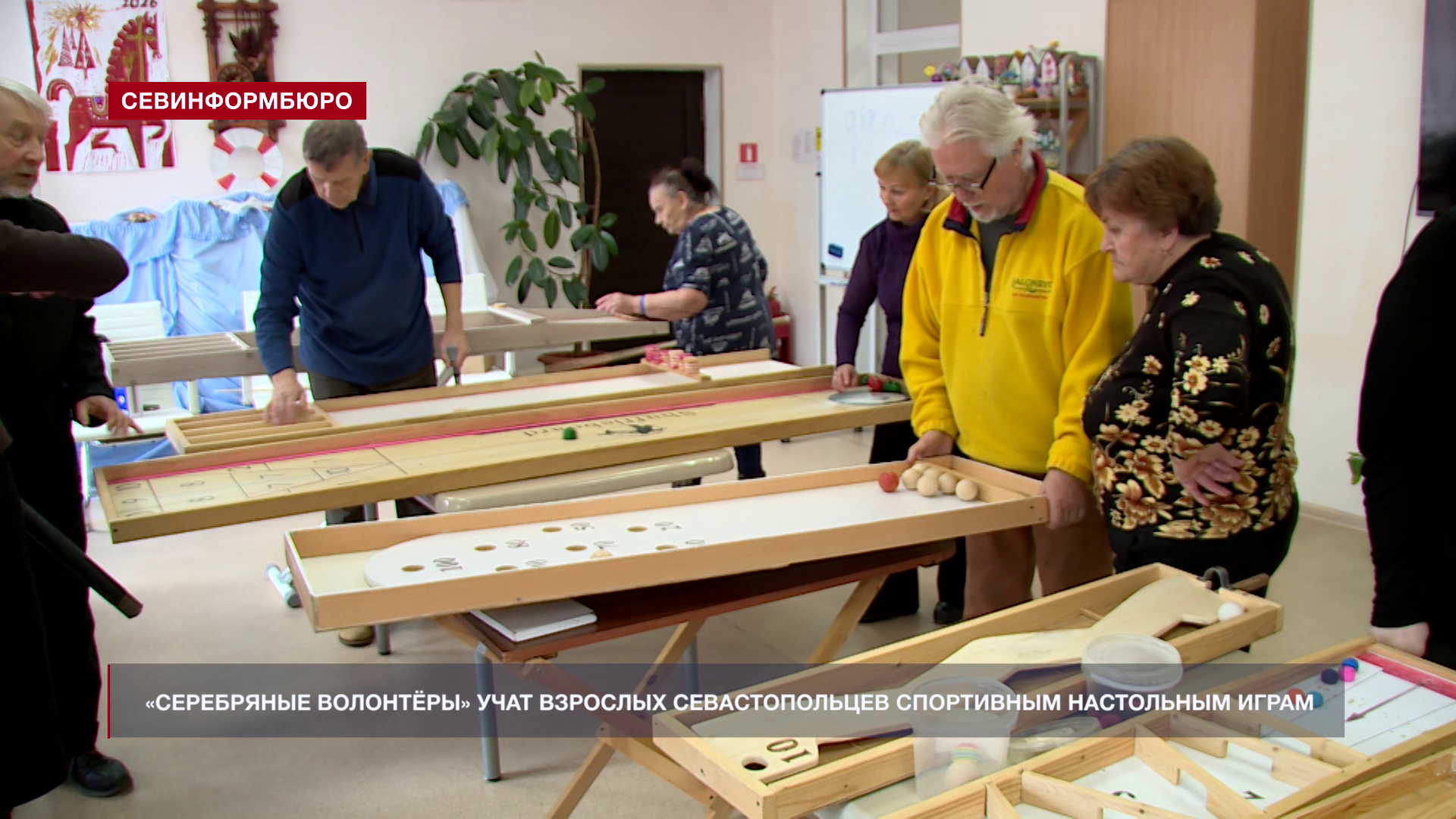 В севастопольском городском комплексном центре социального обслуживания четвёртый год подряд «серебряные» волонтёры проводят занятия для лиц старшего возраста по спортивным настольным играм. Олег Николаев и Вячеслав Гурьев знакомят подопечных и учат не только правильно выговаривать, но и играть в шафлборд, новус и кольбутто.