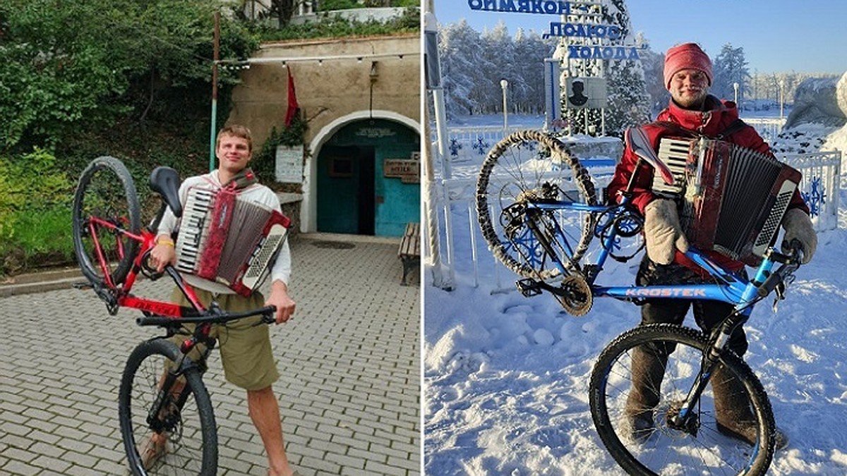 Путешественник-экстремал Клим Калужских уже год не был дома. Он выехал из Новосибирска 31 января 2025 года, чтобы увидеть страну, и на сегодня объехал уже 50 регионов. Его основной транспорт - велосипед. На нем и в холод, и в зной. А часто и вовсе не держась за руль - на ходу играет на аккордеоне, хочет сделать приятное встречным.