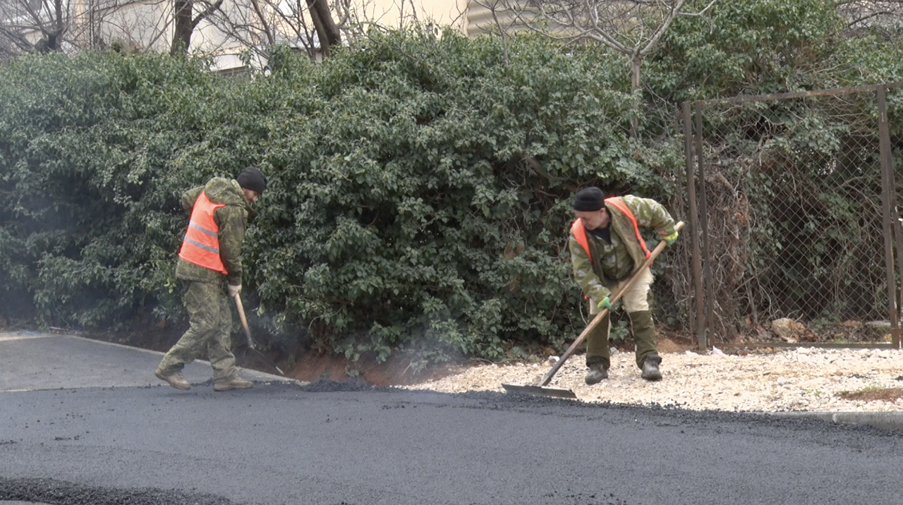У жилых домов №12 и №14 на улице Адмирала Юмашева укладывают больше 1 тысячи квадратных метров нового асфальта, а также бордюрный камень.