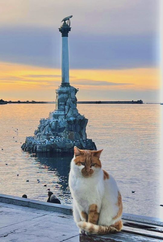 "Мяу, друзья! Солнышко уже село, закат разрисовал небо в лучшие цвета, а морем пахнет так, что даже я, кот с набережной, не могу устоять! Птички весело болтают на памятнике, а жизнь вообще прекрасна! Не забывайте, что у нас тут идеальный вечер для мурлыканья и наблюдения за красотой!"