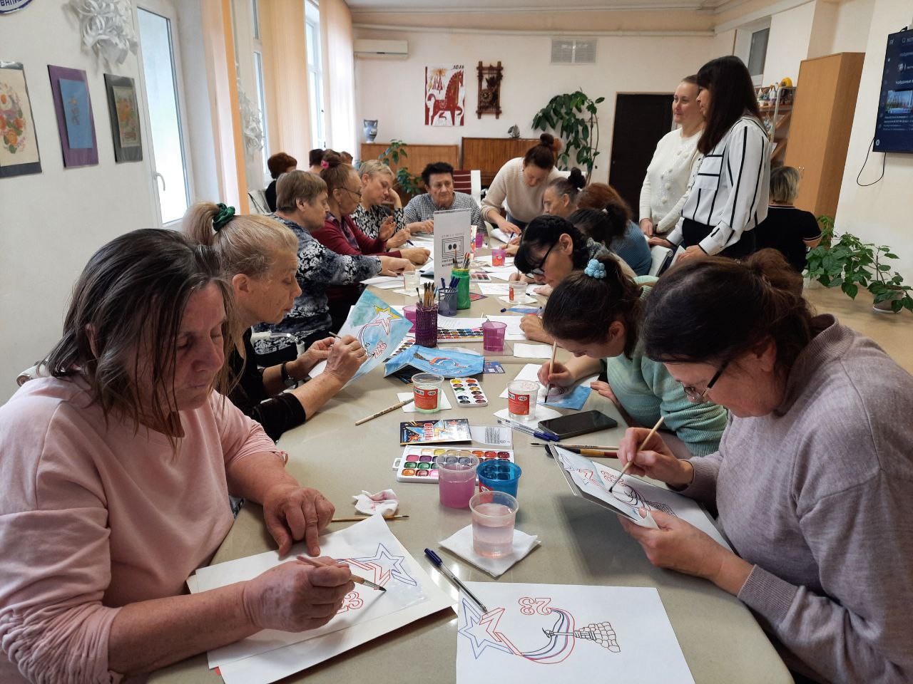 Мероприятие для подопечных центра провели специалисты библиотеки имени Льва Толстого. Участники создавали яркие аппликации, старательно вырезали детали и подбирали цветовую гамму, чтобы каждая открытка получилась по-домашнему уютной.