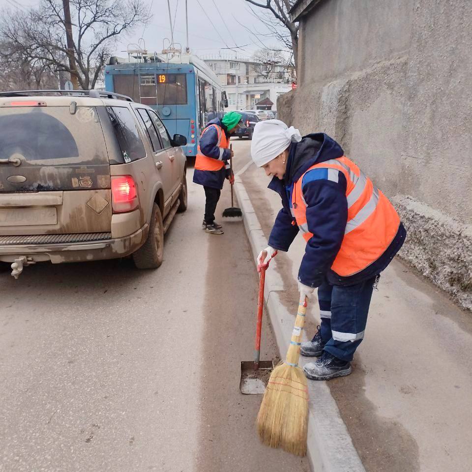 Сотрудники Севастопольского морского порта очищали Троллейбусный спуск и площадь Суворова.