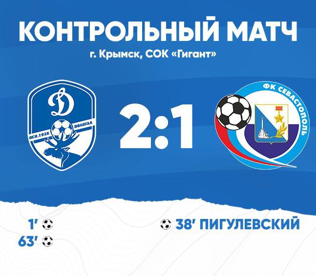 ФК «Севастополь» в Крымске сыграл с вологодским «Динамо». На перерыв футболисты ушли с равным счетом, а во втором тайме спортсмены из Вологды вырвались вперед.