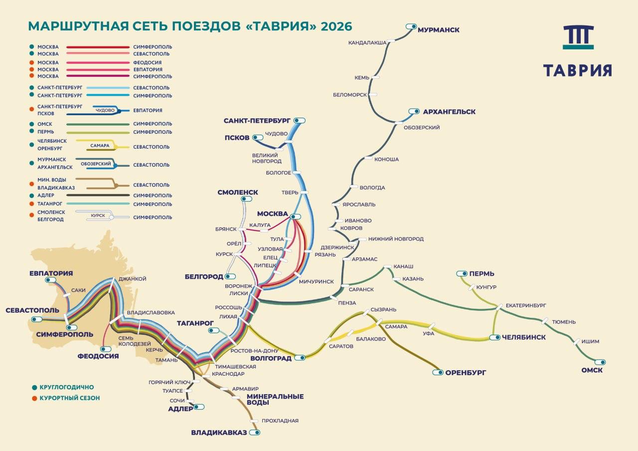 Всего в курортный сезон поезда «Таврия» будут проходить через 48 российских регионов.
