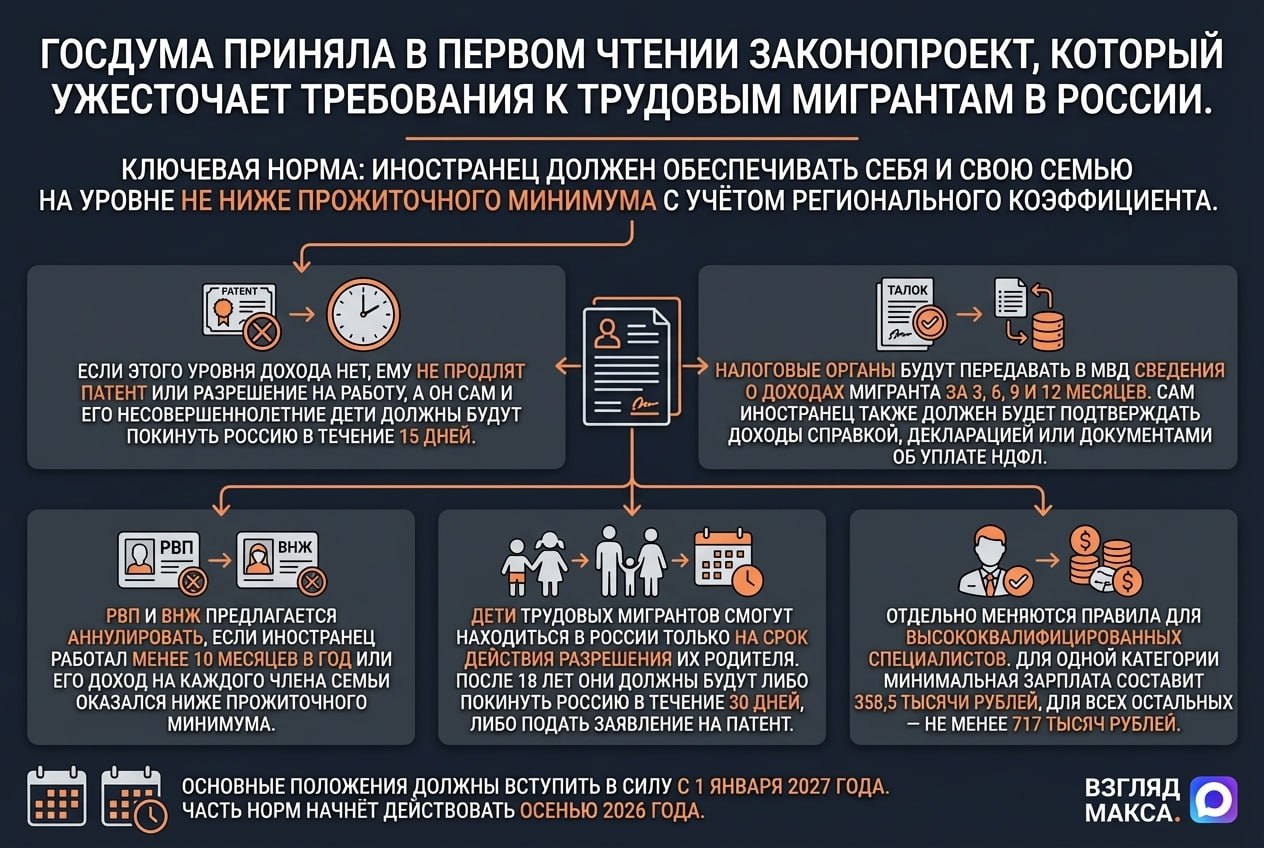 Госдума приняла в первом чтении правительственный законопроект, который вводит дополнительные требования к трудовым мигрантам, работающим в России. Документ предусматривает более жёсткий контроль за уровнем доходов иностранцев, расширяет основания для отказа в продлении разрешительных документов и отдельно регулирует пребывание в стране членов их семей.