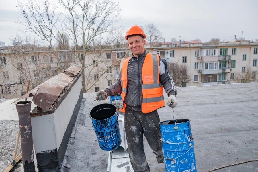 В феврале специалисты приступили к капитальному ремонту плоской крыши. Сейчас на отдельных участках уже укладывают новое наплавляемое покрытие в два слоя, восстанавливают парапеты и систему водоотведения.