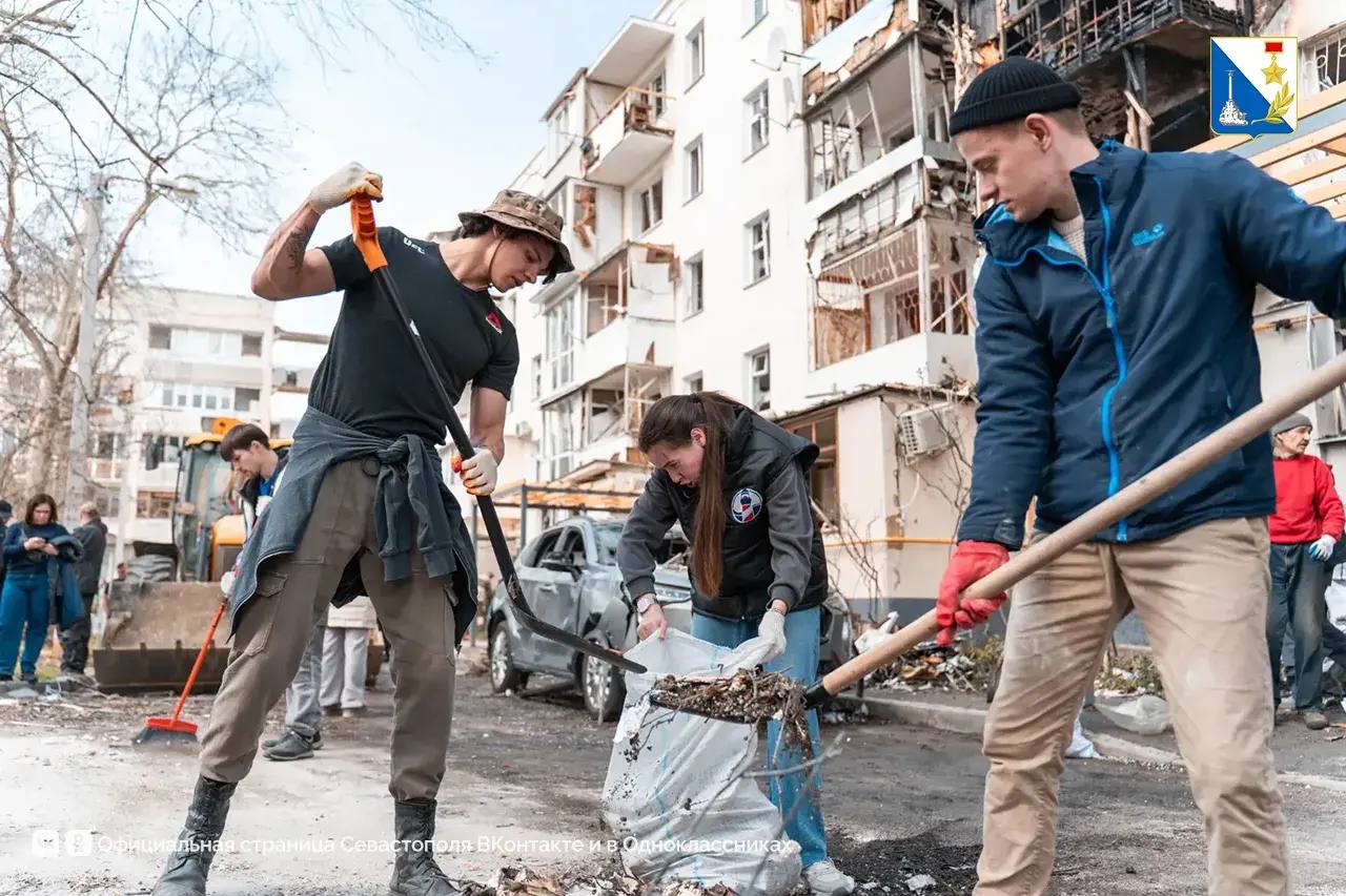 Активисты «Единой России», добровольцы, студенческий корпус спасателей, Народный фронт, «Молодая гвардия», «Здоровое Отечество», студотряды и неравнодушные севастопольцы убирают мусор во дворах и помогают вынести уцелевшие вещи.